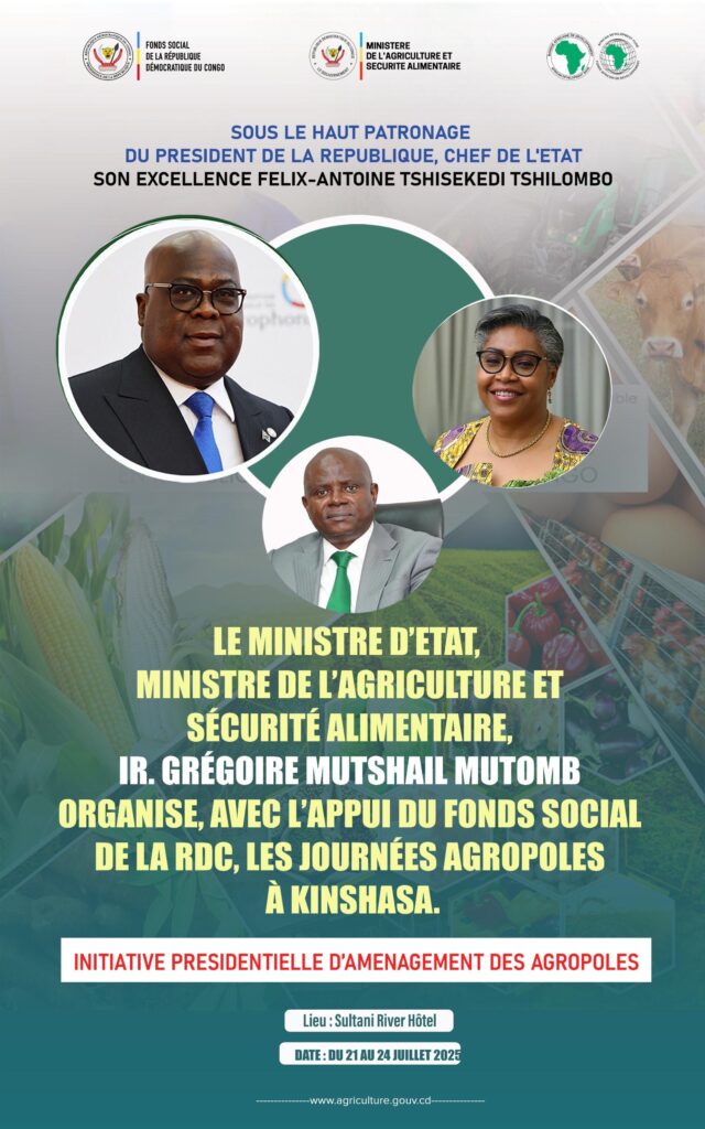 Le gouvernement congolais accélère la mise en œuvre de sa stratégie pour renforcer la sécurité alimentaire. Sous le haut patronage du Président Félix-Antoine Tshisekedi Tshilombo, le ministre d’État, ministre de l’agriculture et de la sécurité alimentaire, Grégoire Muthsail Mutomb organise les “Journées Agropoles” du 21 au 24 juillet 2025 à Kinshasa. L’objectif : sensibiliser et impliquer la population congolaise dans l’initiative présidentielle de l’aménagement de pôles agro-pastoraux.