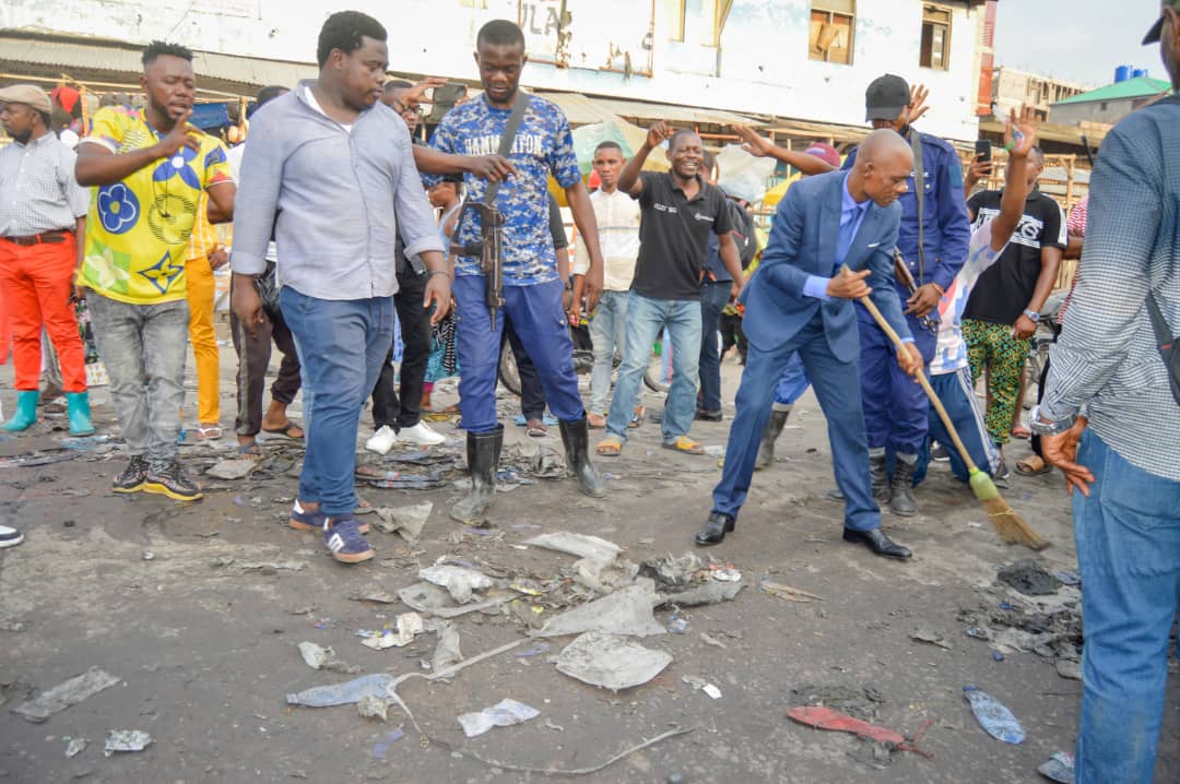 En compagnie de son adjoint, des agents et du président de l’administration de ce marché, Bienvenu Mbalibi Mfama s’est une idée sur ce lieu des négoces installé sur le territoire de sa municipalité. Sur place, il a directement procédé au lancement des travaux d’évacuation des poubelles abandonnées, des déchets plastiques et autres insalubrités.