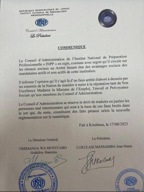 Dans un communiqué rendu public, jeudi 17 août 2023, le Président du Conseil d’Administration (PCA) de l’Institut National de Préparation Professionnelle (INPP), Jean-Marie Lukulasi, et le Directeur Général Stanislas Tshimanga wa Muntuabo ont levé le ton au sujet d’un document qui circule sur les réseaux sociaux.