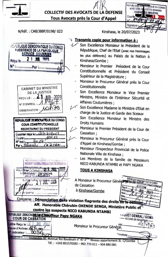 « Depuis le vendredi 14 juillet 2023, aucun membre du collectif n’a été autorisé à s’entretenir avec ses clients. Toutes les demandes faites par les avocats ont été systématiquement rejetées par la commission mise en place de l’instruction préparatoire au commissariat provincial de la police nationale Ville de Kinshasa », a écrit ce collectif des avocats.