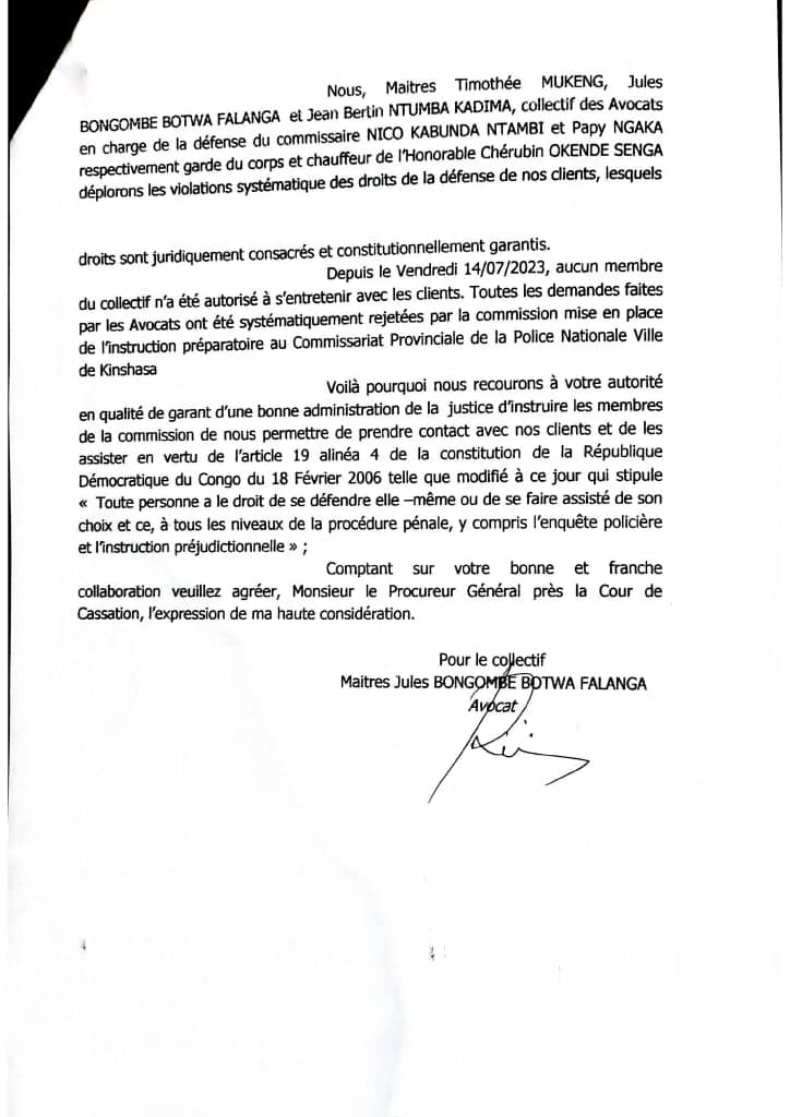 Dans une correspondance adressée, ce vendredi 21 juillet, au procureur général près la Cour de cassation, le collectif des avocats du garde du corps et du chauffeur de Chérubin Okende déplorent « la violation des droits de la défense de leurs clients ».